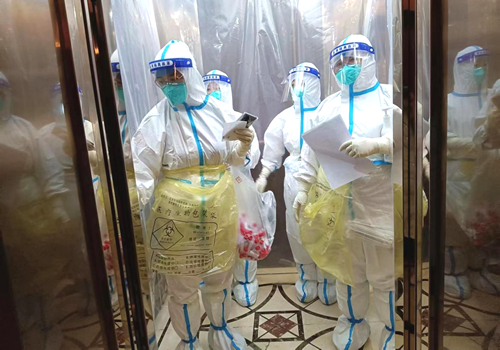 面對始料未及的新冠疫情再次來襲,職工醫(yī)院全體女醫(yī)護人員不再慌張,而是緊張有序的進行著每一項工作。她們細心的為承接的LV隔離酒店隔離區(qū)進行嚴密消殺,每日從專用步行梯人工運送垃圾,為隔離人員按時進行核酸檢測、送水送飯。進入隔離區(qū)最快也要持續(xù)4、5個小時,一套流程下來整個防護服都濕透了,這些可愛的天使們還打趣道“又洗了個天然沐浴”!